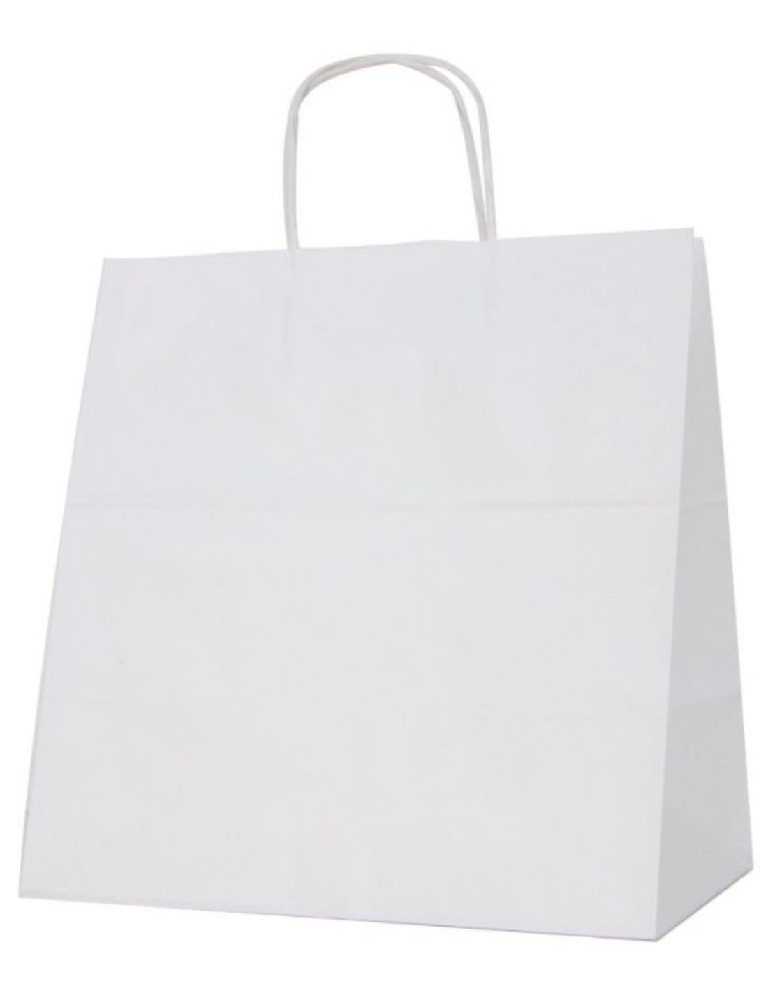 Bolsa de papel kraft con asa plana, fabricada con papel de color blanco de 80 gramos, una bolsa económica para comercio disponible en varias medidas.