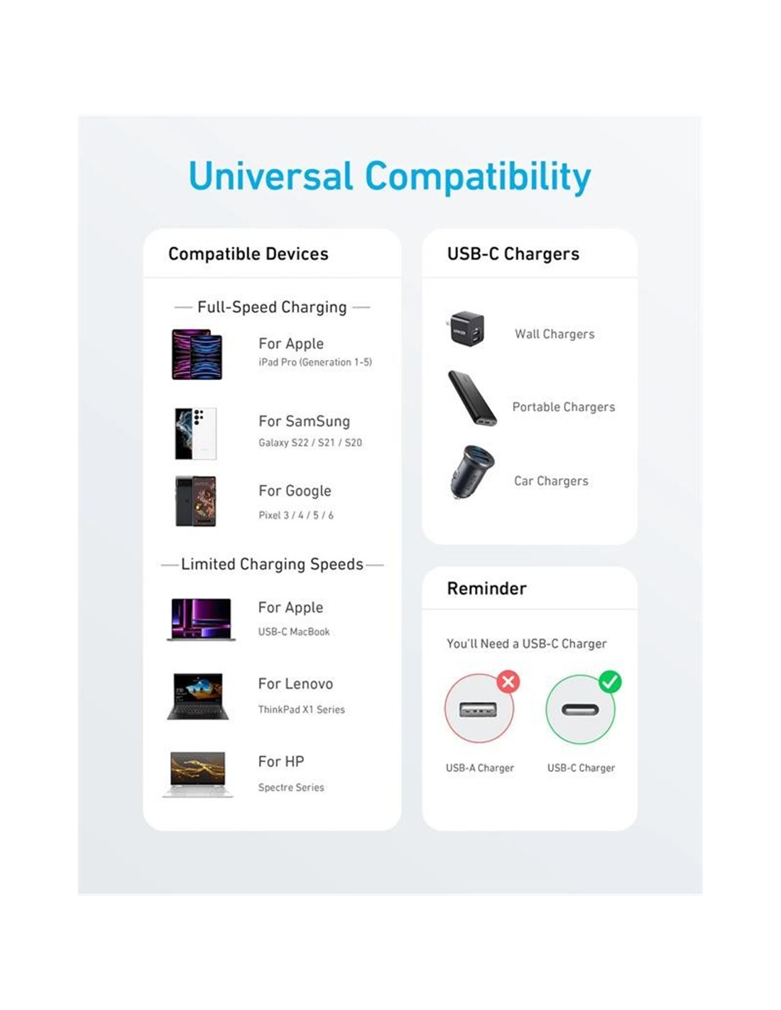 Ventaja Anker: Únete a los más de 80 millones impulsados por nuestra tecnología líder. Compatibilidad de Alta Velocidad: Carga un Samsung S23 hasta un 55% en solo 30 minutos con un cargador Power Delivery compatible (cargador no incluido). Construcción Duradera: Probado en estrictas pruebas de laboratorio para resistir hasta 10,000 flexiones. Carga Confiable: Cumple con los estándares USB-IF para una carga segura y confiable en prácticamente cualquier dispositivo USB-C.