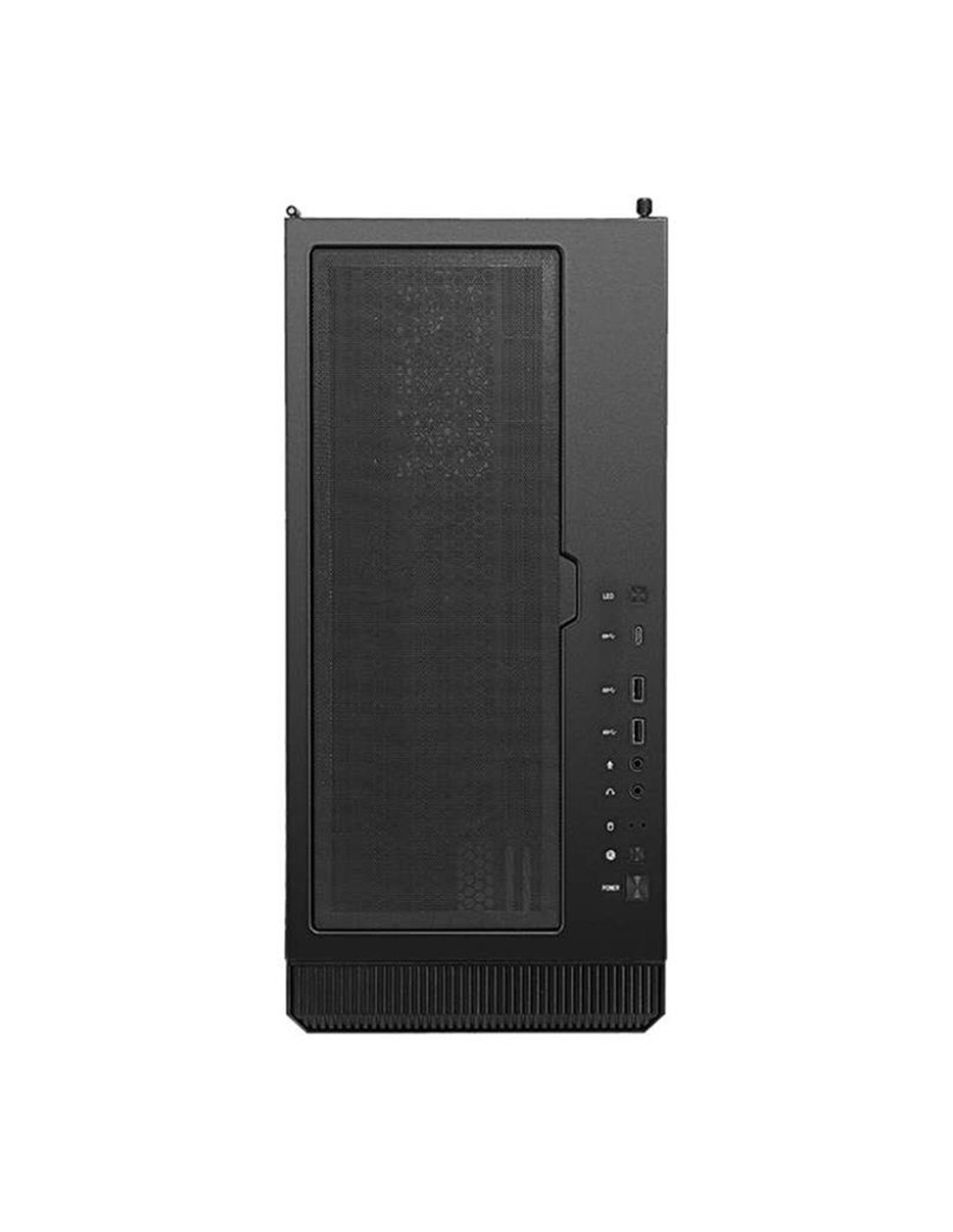 El panel de conectividad superior cuenta con 2 puertos USB 3.0, un puerto USB 3.2 Tipo C y conectores de auriculares y micrófono de 3.5 mm, proporcionando acceso rápido a dispositivos y periféricos externos. Los filtros de polvo integrados (en la parte superior e inferior) mantienen la torre libre de suciedad, mejorando el flujo de aire y protegiendo los componentes internos.