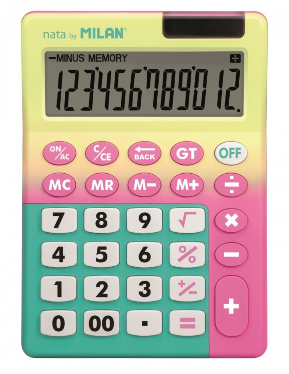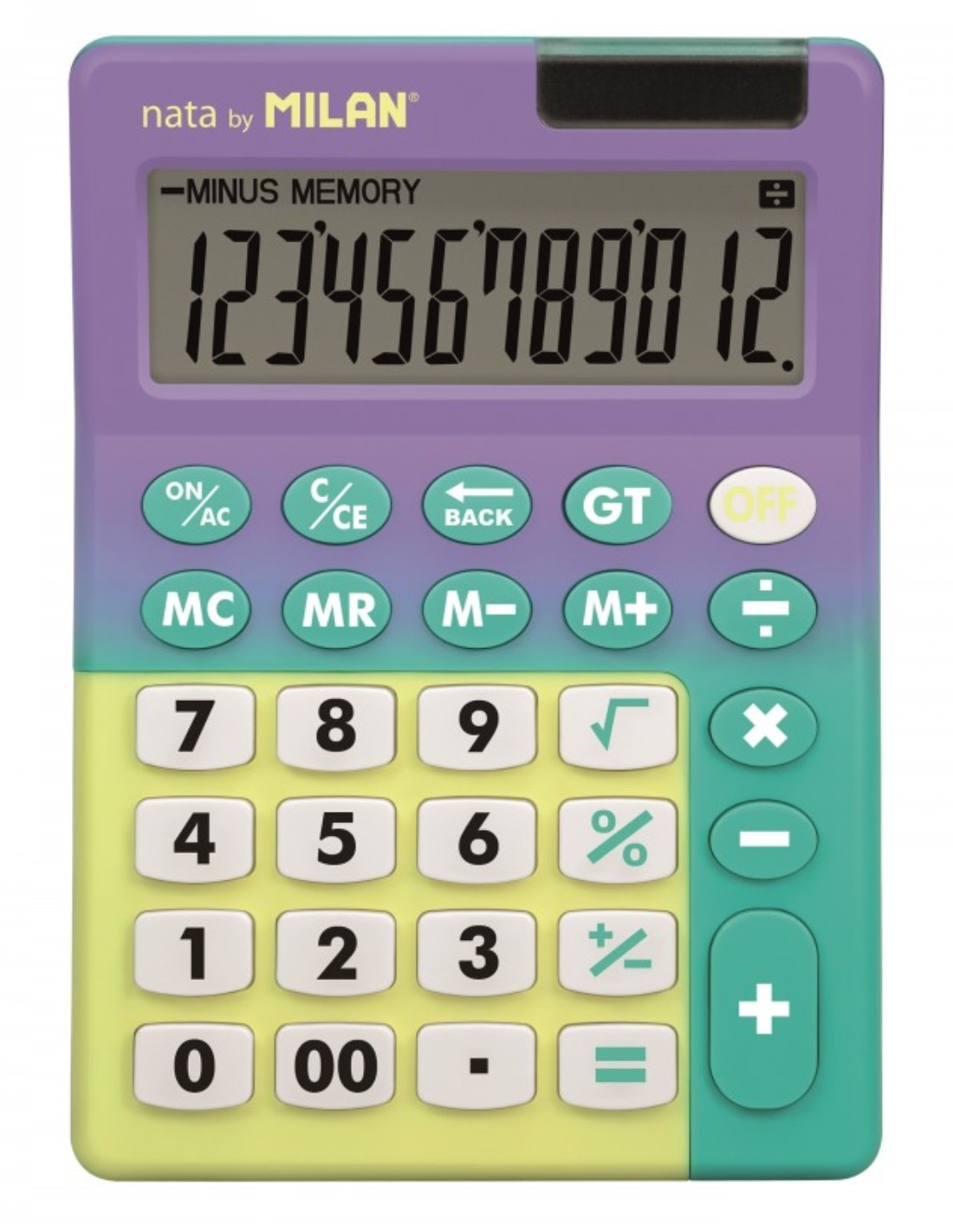 Calculadora de sobremesa de 12 dígitos, serie Sunset. 4 teclas de memoria, función raíz cuadrada, función Gran Total y función de retroceso. Tecla de apagado. Alimentación dual: célula solar y pila de 1,5 V.
