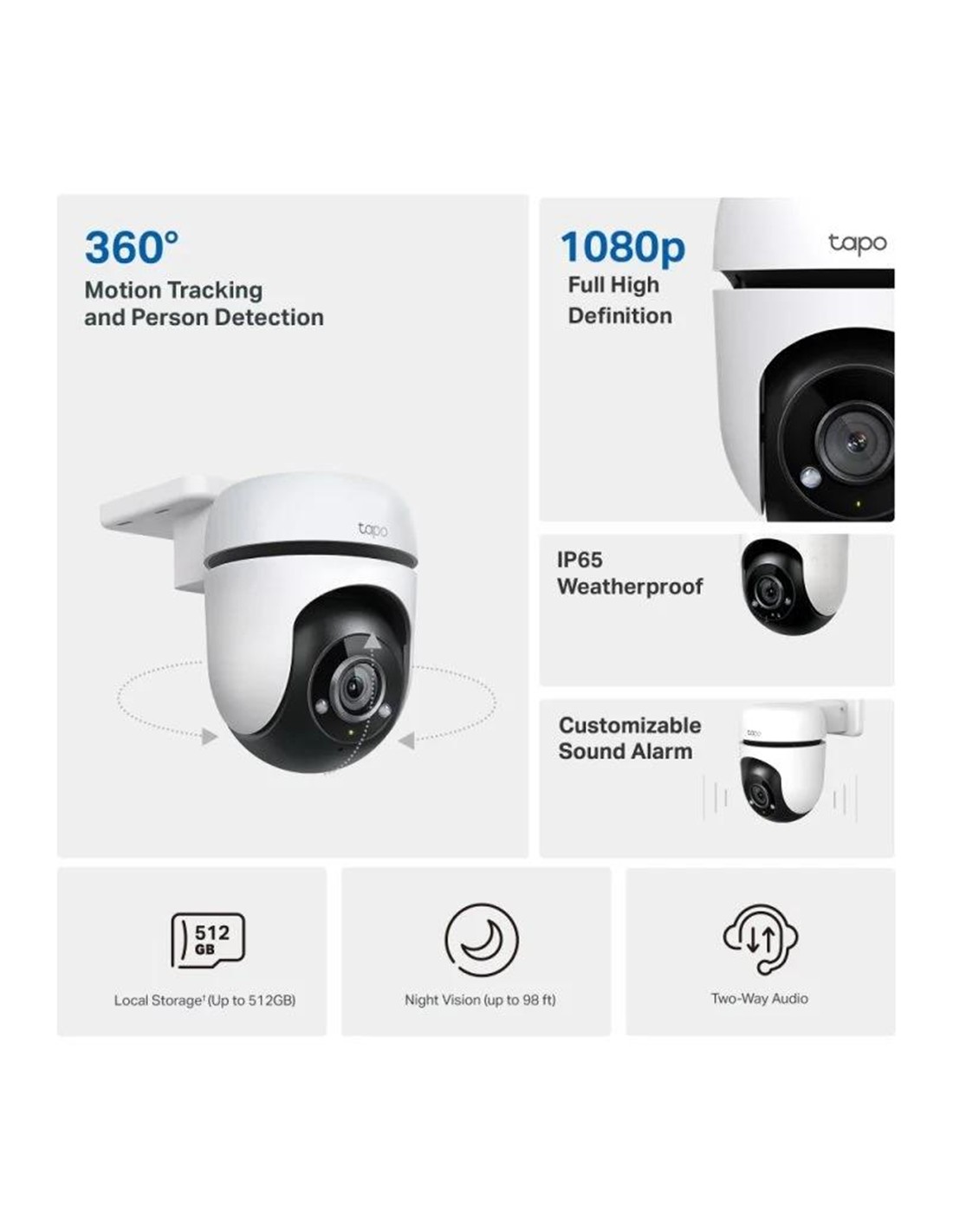 - Almacenamiento seguro: Guarda los vídeos en una tarjeta microSD de hasta 512GB o utilizando los servicios de almacenamiento en la nube Tapo Care.