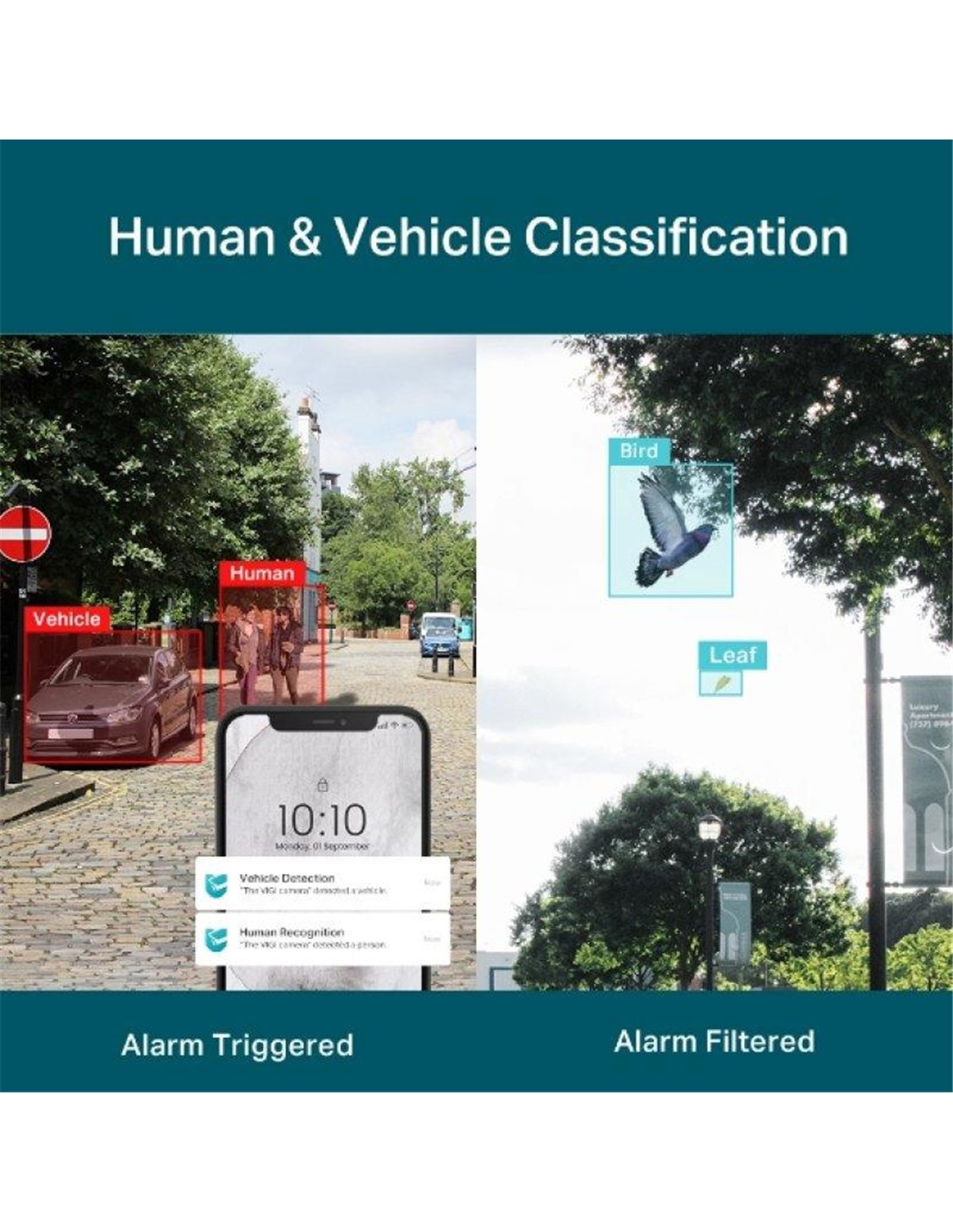 - Clasificación de personas y vehículos: Distingue a las personas y los vehículos de otros objetos, para que recibas notificaciones de eventos más precisas.