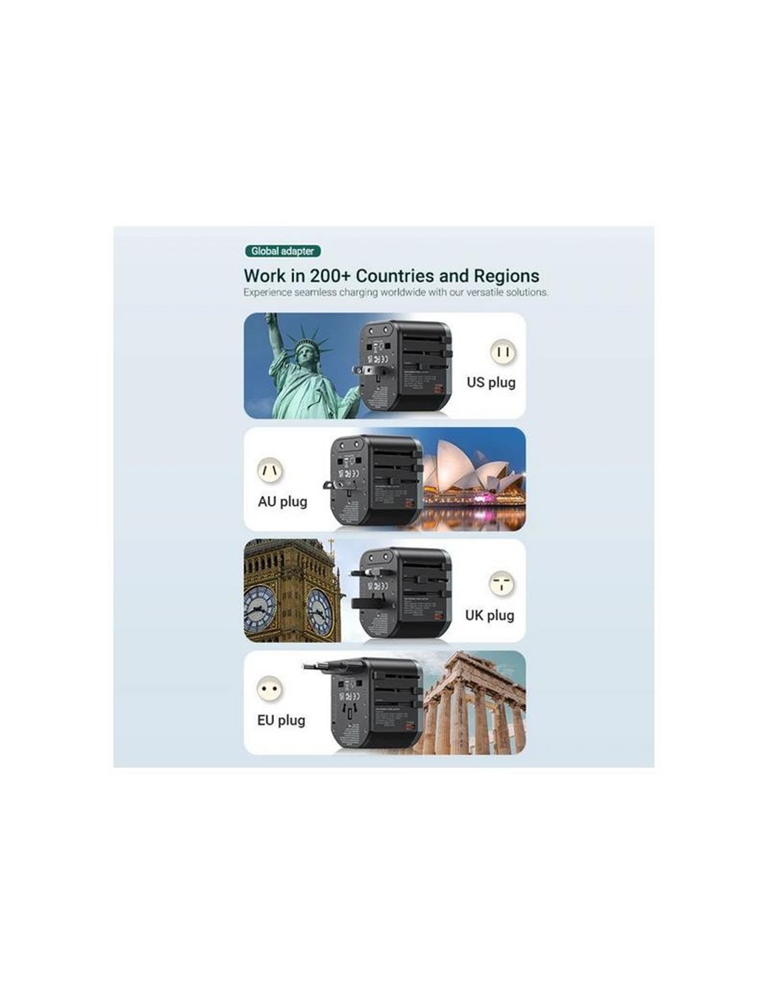 Enchufe múltiple compatible a nivel mundial: Ideal para usar en distintos países sin necesidad de adaptadores adicionales.