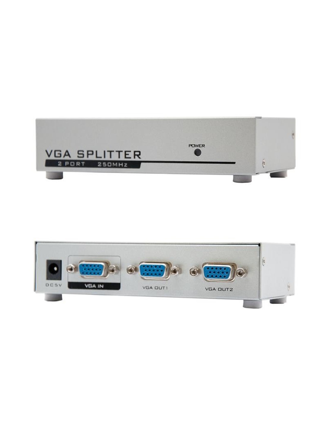 Nanocable VGA DUPLICADOR PARA 2 MONITORES CON ALIM.. Tipo de puerto de vídeo: VGA. Máxima resolución: 1920 x 1440 Pixeles, Color del producto: Plata, Material de la carcasa: Metal. Longitud del paquete: 6 cm, Ancho del paquete: 100 mm, Altura del paquete: 230 mm. Contenido del paquete: RoHS - Duplicador SVGA para 2 monitores con fuente de alimentación.\n- El duplicador SVGA de 2 Puertos permite que una sola fuente VGA pueda proporcionar imágenes en dos monitores simultáneamente. Perfecto para aulas, ferias, exposiciones, o exhibidores dentro de comercios donde se requiere alta calidad de vídeo en varios monitores. La simple operación plug and play facilita la configuración, por lo que este dispositivo se puede instalar y comenzar a utilizar en poco minutos.\n- El duplicador soporta hasta 250 MHz de ancho de banda, proporcionando imágenes con resoluciones de hasta 1920x1440. Dispone de un circuito de amplificación de señal incorporado que permite visualizar imágenes a 65 metros de la fuente.\n- Permite la conexión en cadena margarita\n- Puerto de entrada de señal: macho\n- Puerto de salida de señal: hembra\n- Carcasa metálica resistente\n- Cables SVGA no incluidos