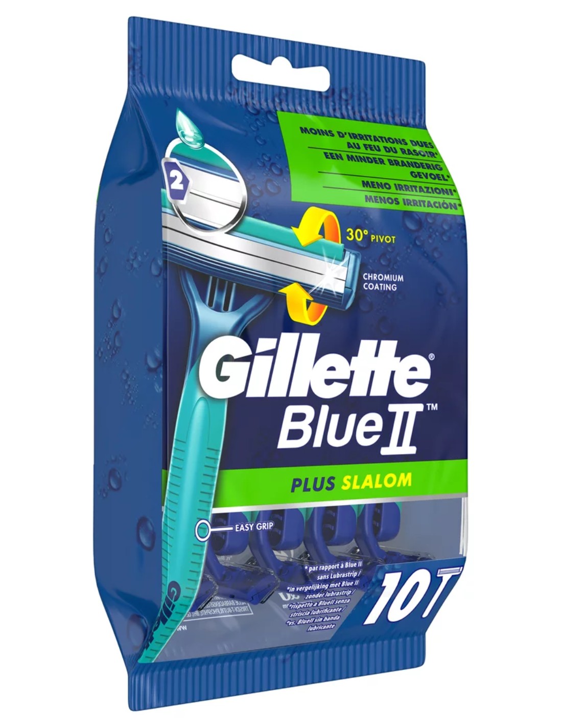 La maquinilla desechable para hombre Gillette BlueII Plus Slalom tiene dos hojas con revestimiento en cromo que alargan su vida útil, de esta forma, no tienes que cambiar de maquinilla tan a menudo.