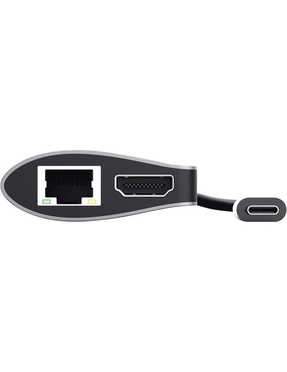 Elegante adaptador multipuerto en aluminio para añadir puertos HDMI, de red, lector de tarjetas, USB-C y USB al portátil utilizando una única conexión USB-C