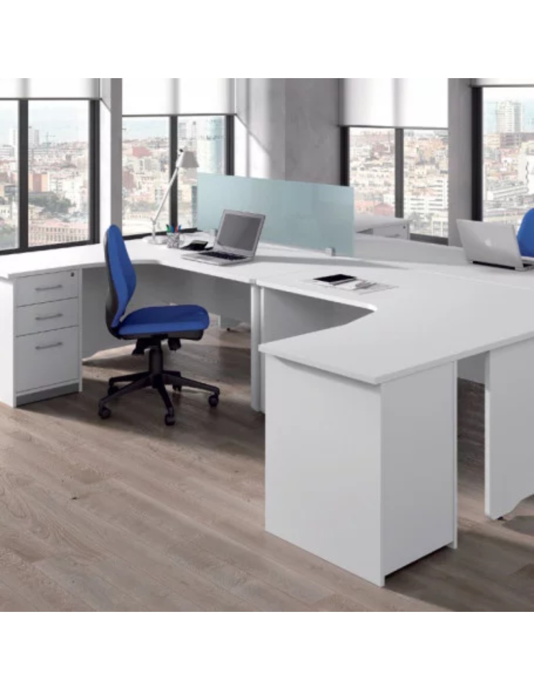 La gama Work busca la ergonomía en todas sus piezas, por eso crea diseños de líneas suaves y sin aristas que proporcionan bienestar y confort. Superficie de mesa: melanímico sobre aglomerado de 25 mm de grosor con cantos de PVC de 2 mm. Superficie de mesa con cantos rectos y estructura con cantos redondeados. Medidas (An x Prof x Al): 160 x 120 x 80 cm. Forma en L en la parte derecha