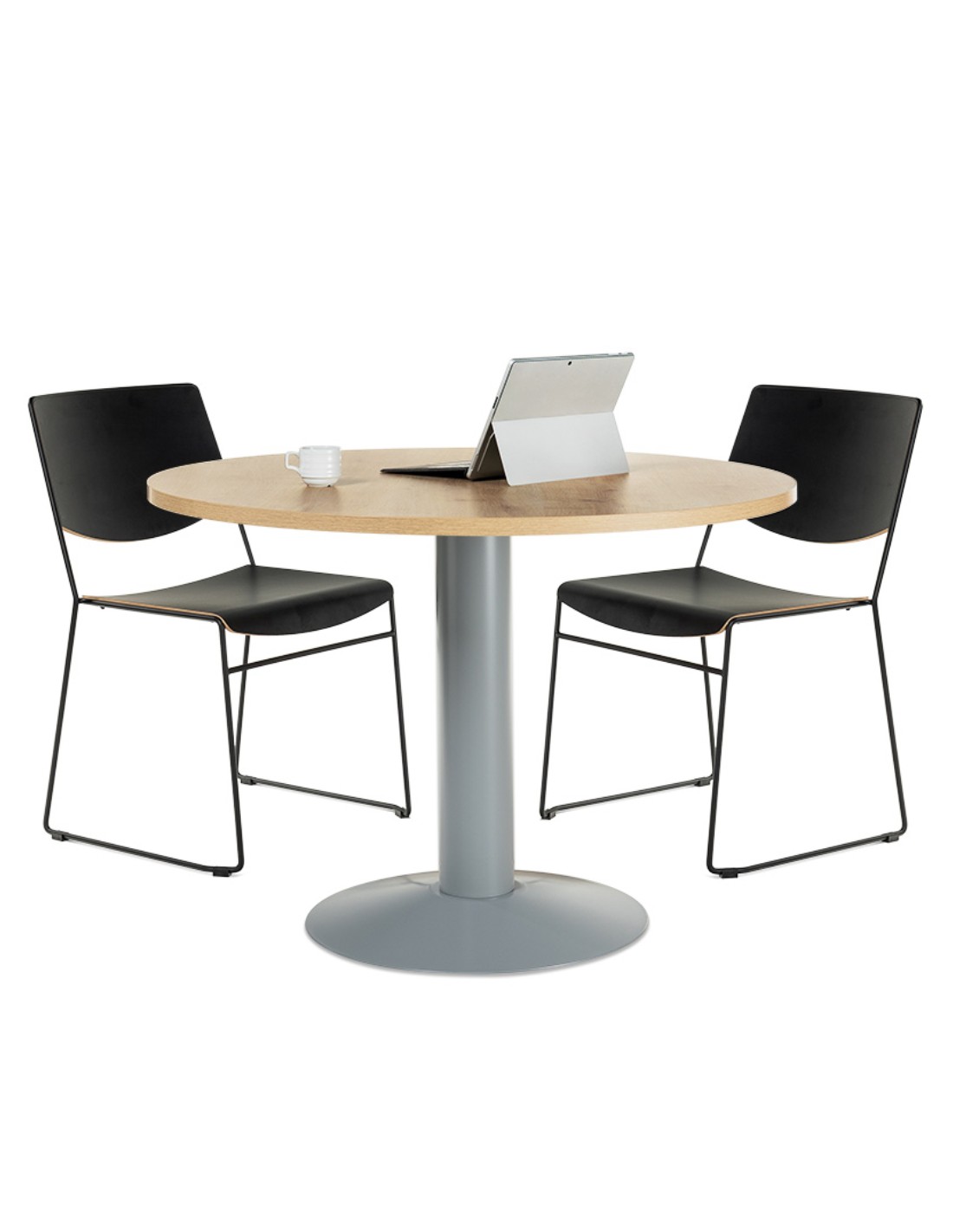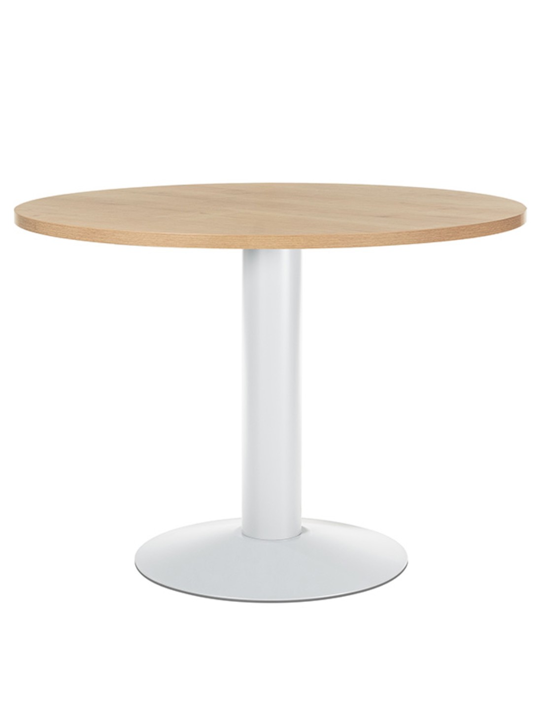 Mesa de reunión circular, con estructura de acero, pensada para atender a clientes, proveedores, trabajos en grupo, y cubrir las necesidades de reunión, con la intención de mejorar la funcionalidad de su oficina y área de trabajo. Compuesta de pie de columna realizado en plancha metálica pintada epoxy, color según modelo, y 5 acabados de tablero diferentes: haya, gris, blanco, cristal o roble.