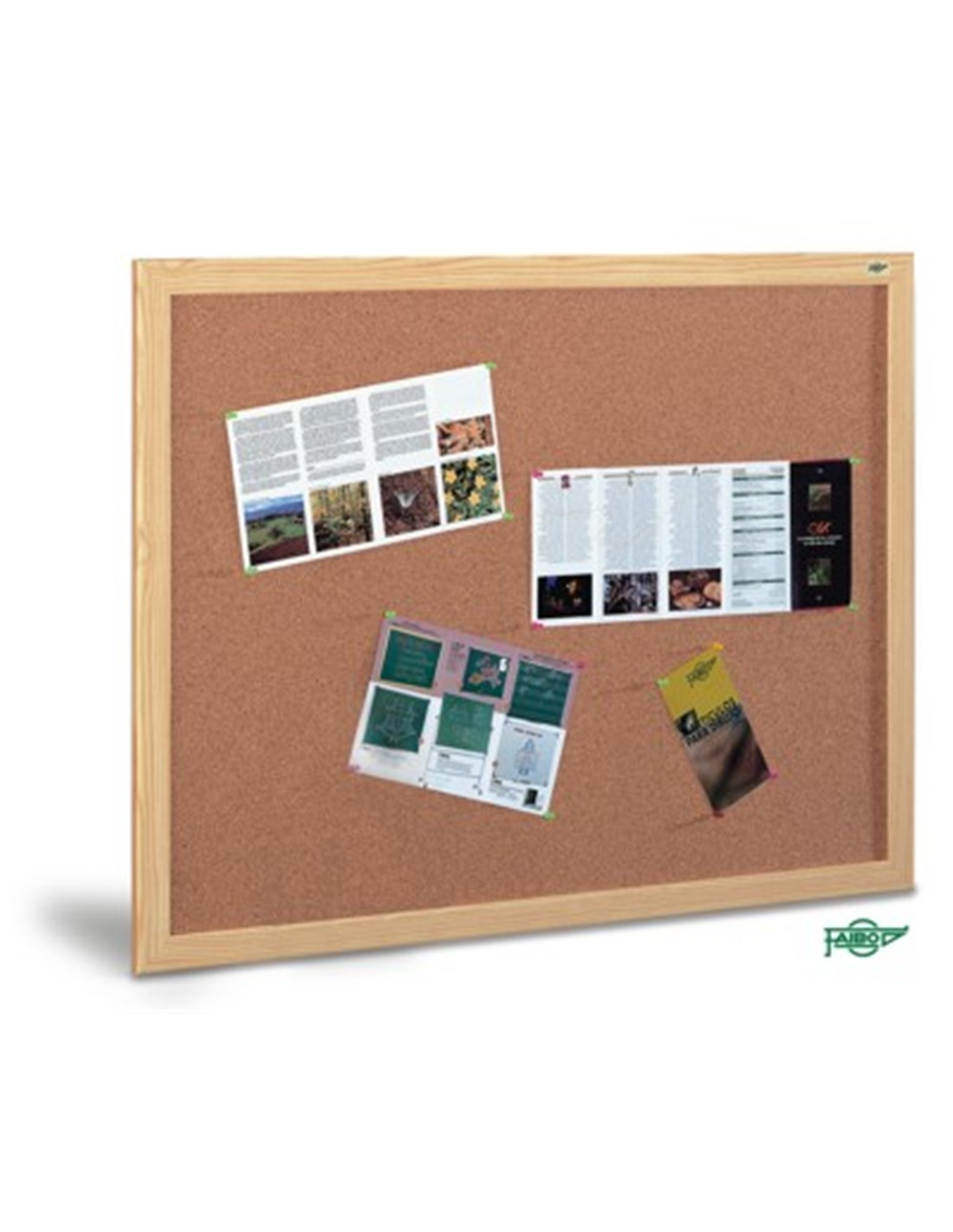 En marco de fibra melaminada símil roble, superficie de corcho de 5 mm. de espesor.