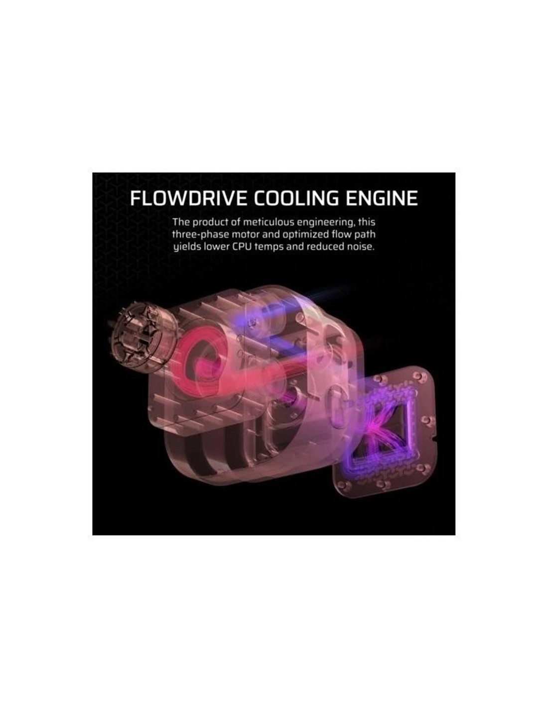 - MOTOR DE REFRIGERACIÓN FLOWDRIVE. Diseñada internamente por los ingenieros expertos de CORSAIR, la alimentación de la bomba procede de un motor trifásico con mayor caudal y niveles sonoros aún más bajos que sus predecesores. Si a eso le añadimos un perfil de superficie de la placa refrigerante diseñado con precisión que maximiza el contacto con el IHS de la CPU, tenemos la receta para conseguir temperaturas siempre más bajas.