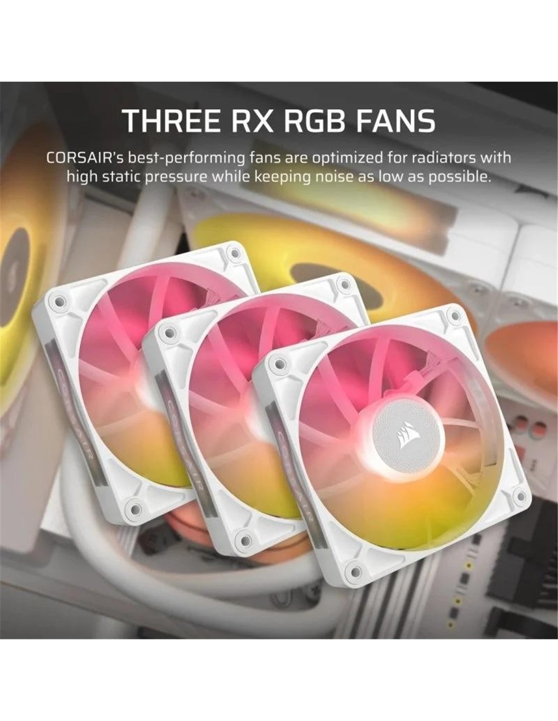 - Ventiladores iCUE LINK RX RGB premontados: Los ventiladores RX RGB están específicamente diseñados para un alto flujo de aire y presión estática, destacando como ventiladores de refrigeración de radiador. La tecnología AirGuide de CORSAIR y los rodamientos Magnetic Dome ofrecen un rendimiento de refrigeración y bajo ruido sin rival.