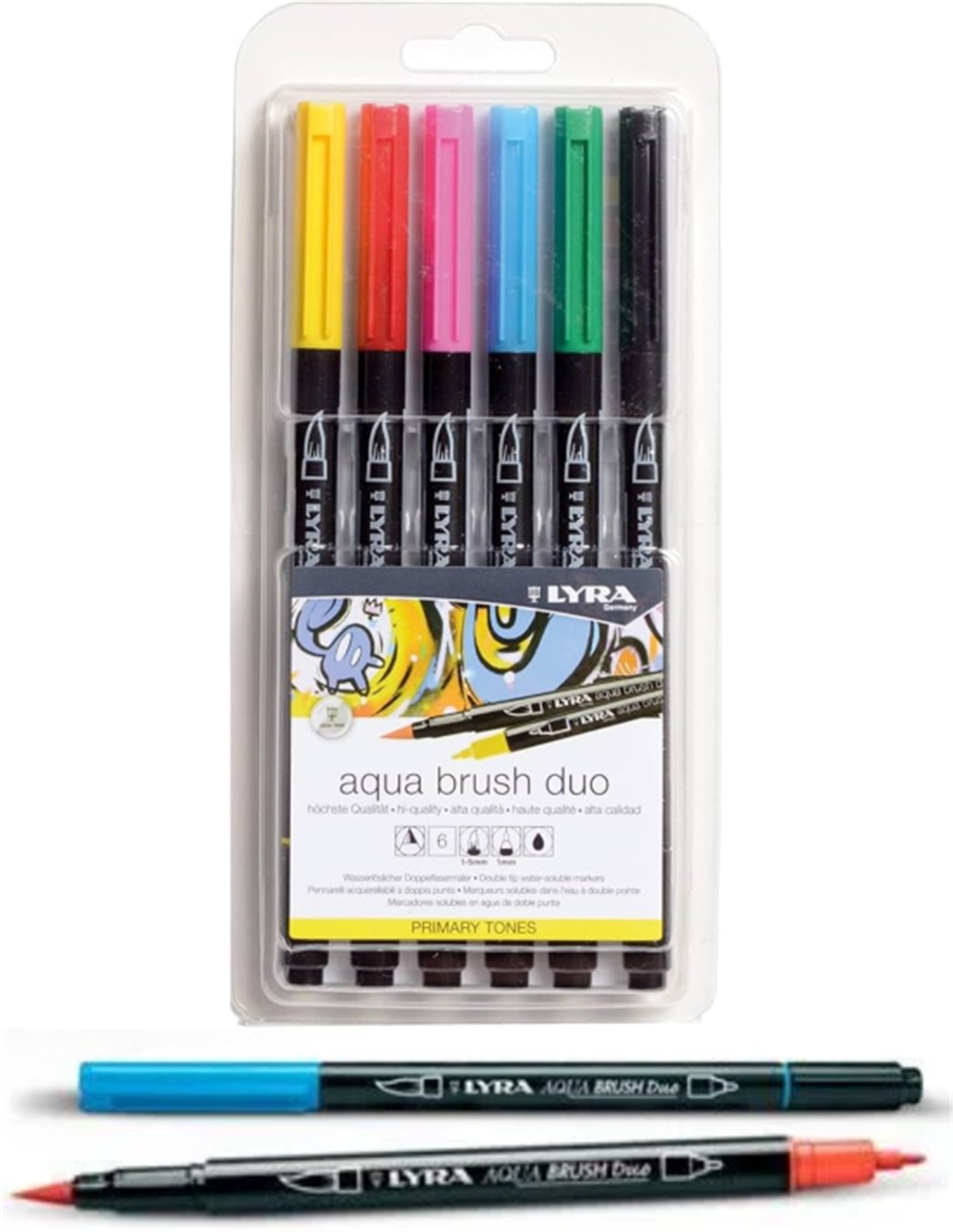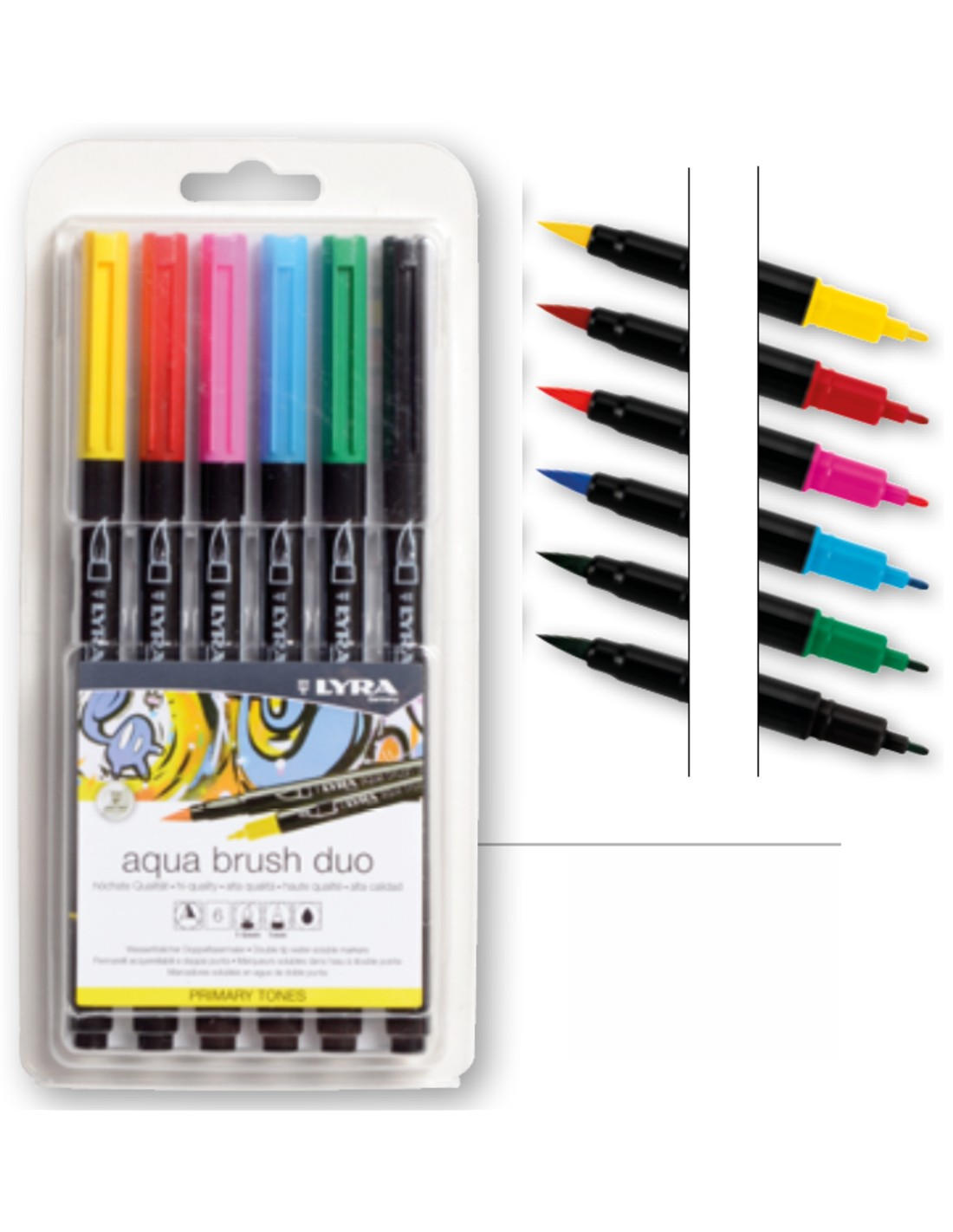 Rotulador Lyra aqua brush acuarelable doble punta y pincel tonos primarios blister de 6 unidades surtidas.