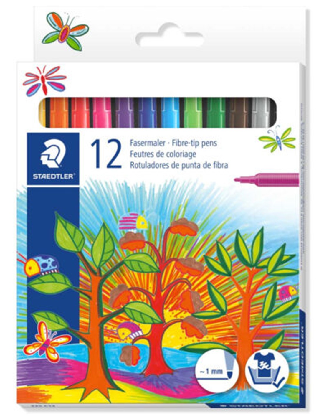 Estuche con 12 rotuladores finos con punta de fibra, lavable en la mayoría de tejidos, capuchón ventilado, ancho de línea 1,0 mm aprox.