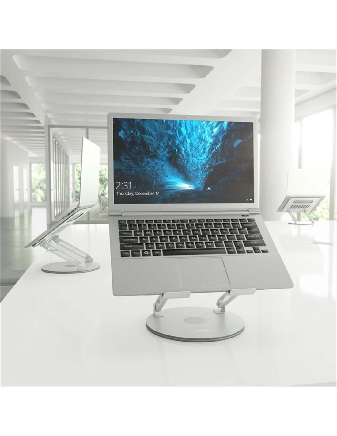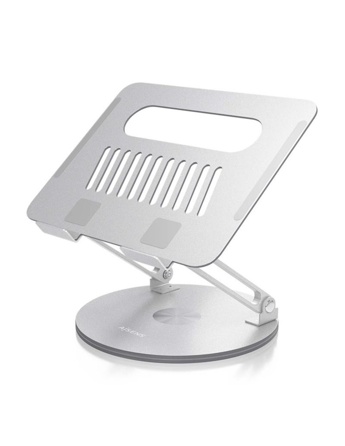> Este soporte está diseñado con una base giratoria que permite una rotación de 360 grados, brindando una versatilidad excepcional para ajustar la posición de tu portátil de manera cómoda y conveniente.
