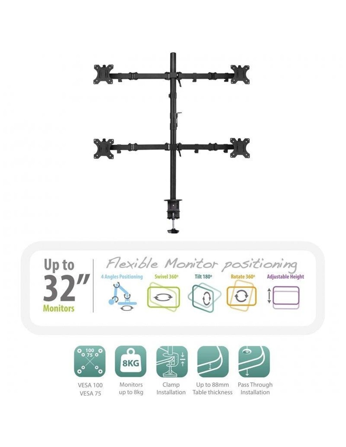 - Soporte de metal para 4 monitores de hasta 32 pulgadas y 8 kg cada uno.
