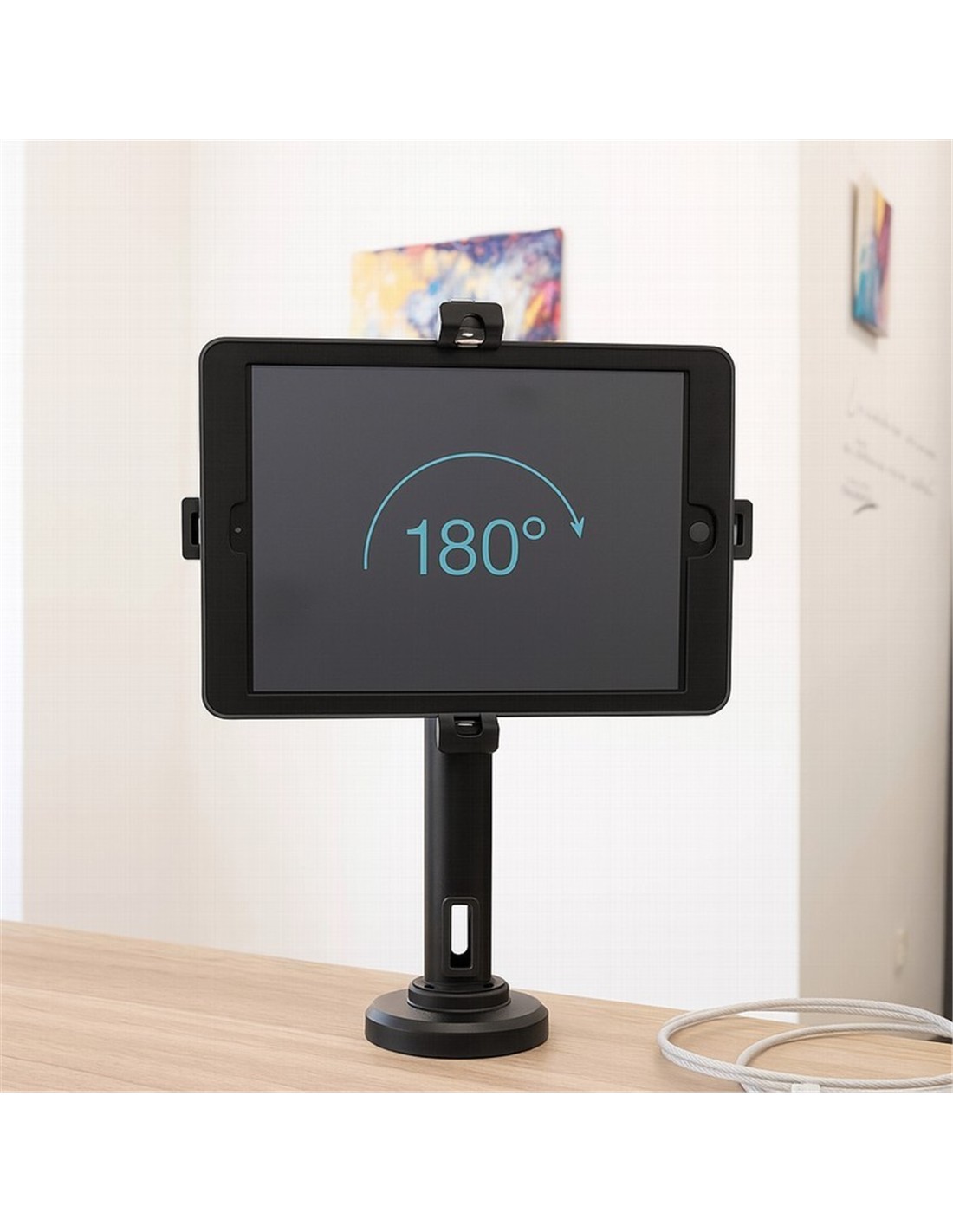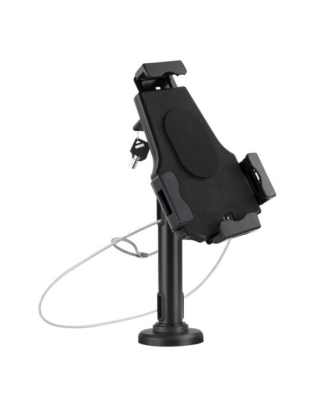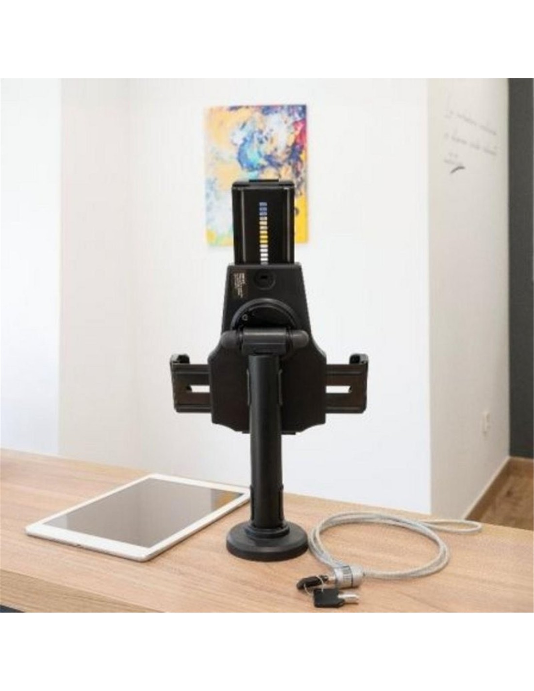 Seguridad profesional para tablets. Este soporte antirrobo de sobremesa o pared está diseñado especialmente para negocios, comercios y espacios públicos que buscan proteger dispositivos sin renunciar a la funcionalidad ni al diseño. Su estructura en acero de alta calidad proporciona robustez y resistencia frente a robos e intentos de manipulación no autorizada.