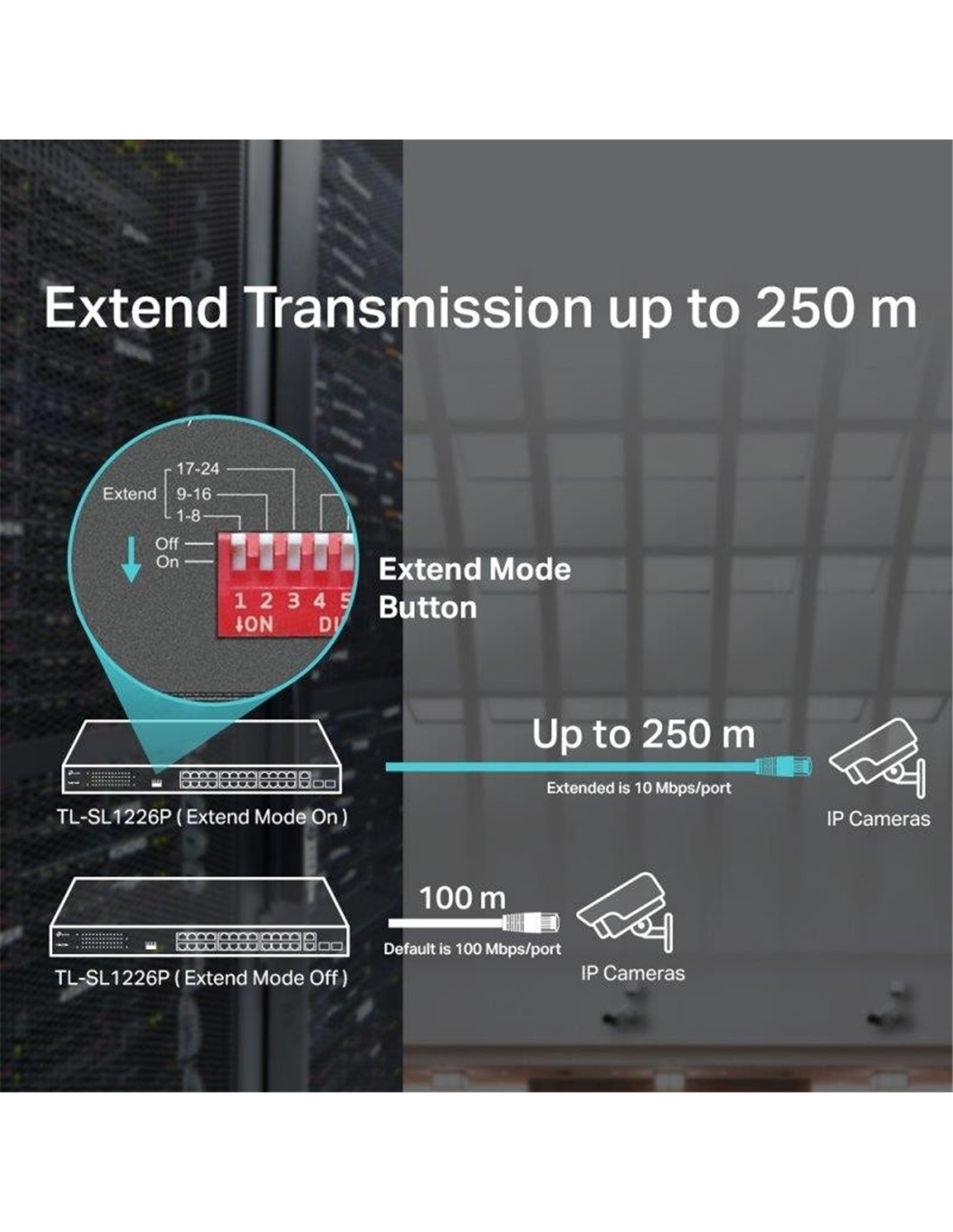 - Hasta 250m de distancia de transmisión de datos y energía PoE en modo Extensor, ideal sistemas de vigilancia.
