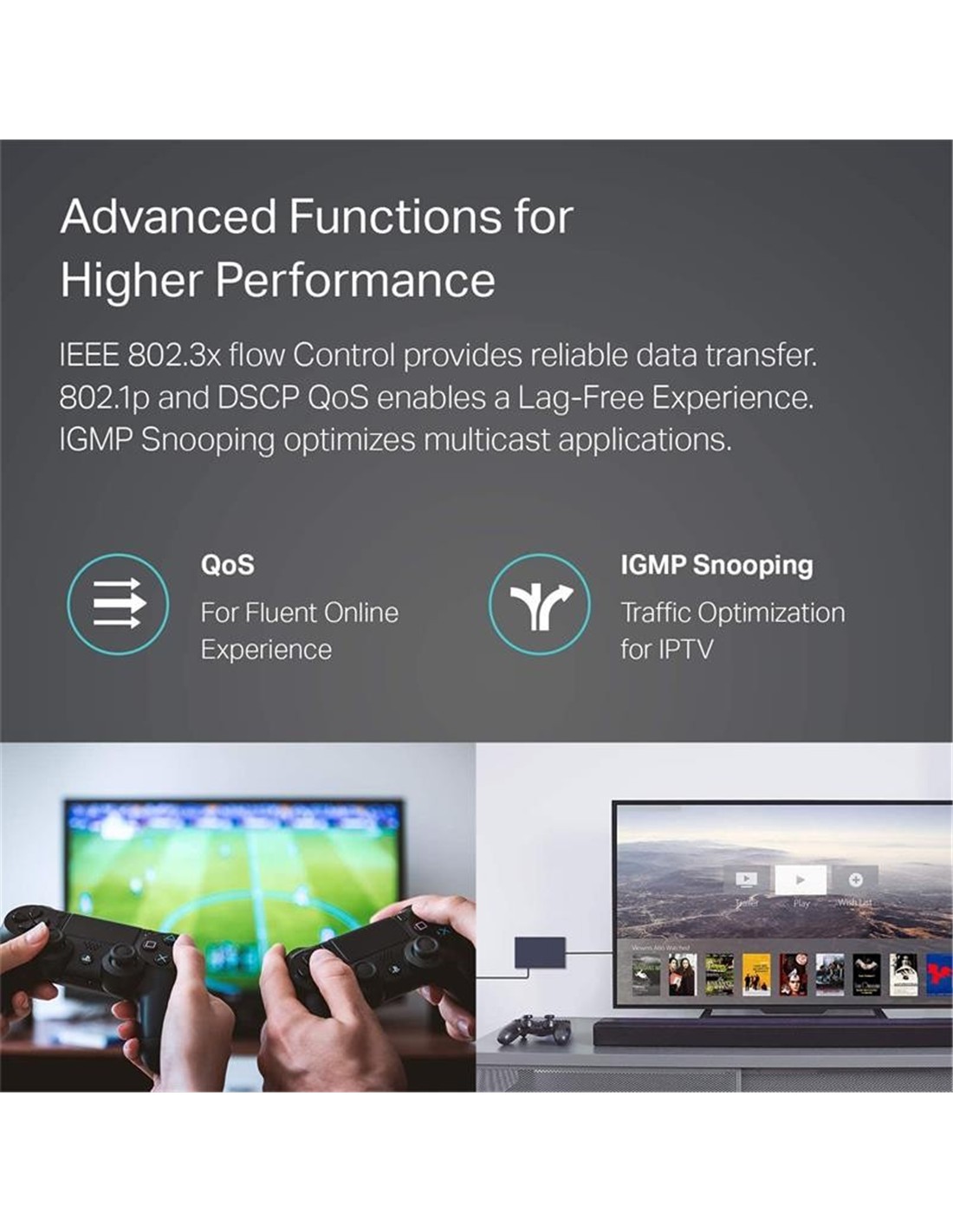 - Optimización de tráfico. 802.1p y DSCP QoS permiten un tráfico suave sensible a la latencia, como voz y video, e IGMP Snooping optimiza el flujo de datos de multidifusión.