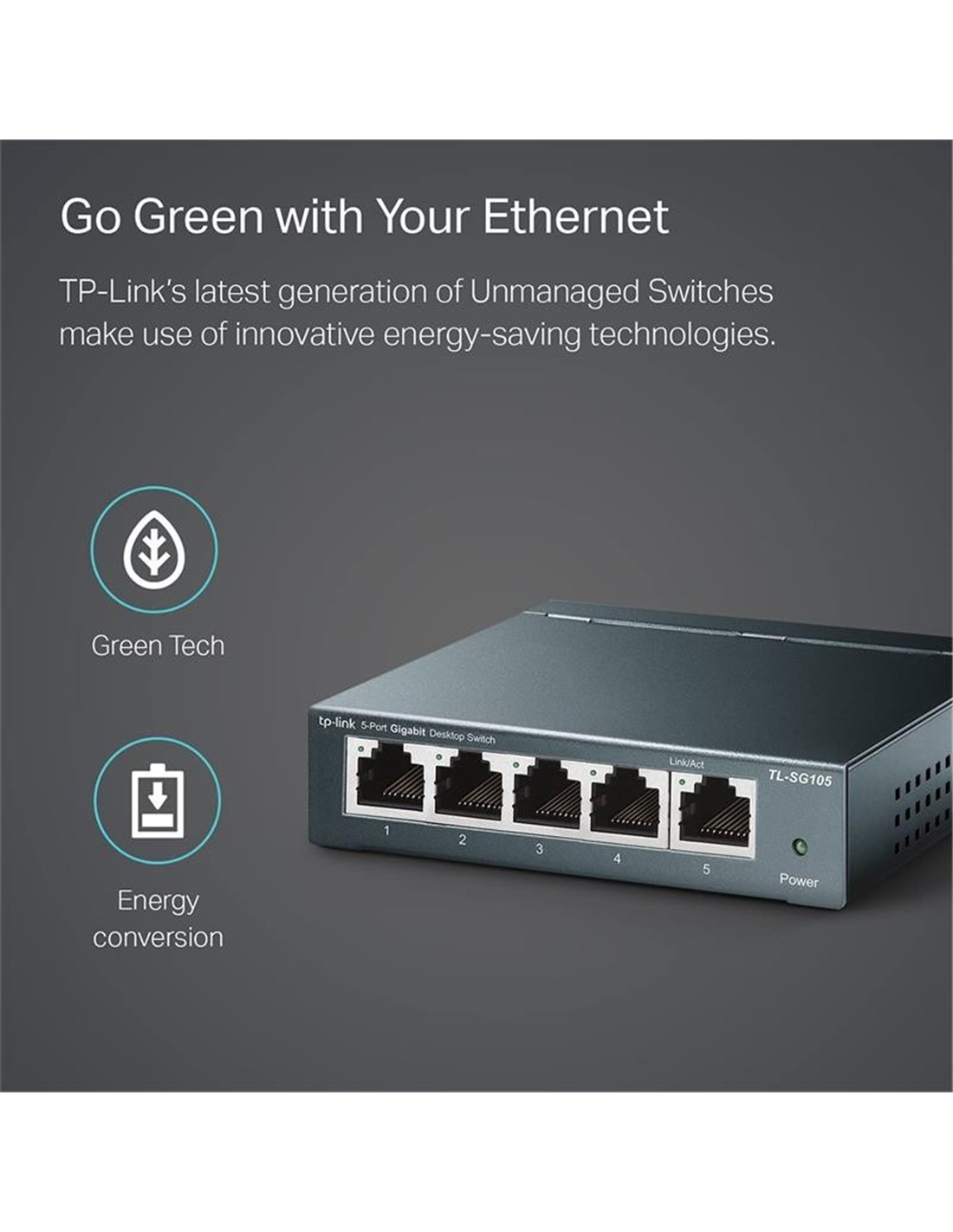 - Hazte Verde Con Tu Ethernet. ¡Ahora tienes la opción de ser ecológico al actualizar a una red gigabit! Esta nueva generación de switches de escritorio TL-SG105S de 5 puertos a 10/100 / 1000Mbps presenta las últimas tecnologías innovadoras de eficiencia energética que pueden ampliar en gran medida la capacidad de tu red con mucha menos energía. Ajusta automáticamente el consumo de energía de acuerdo con el estado del enlace y la longitud del cable para limitar la huella de carbono de tu red.
