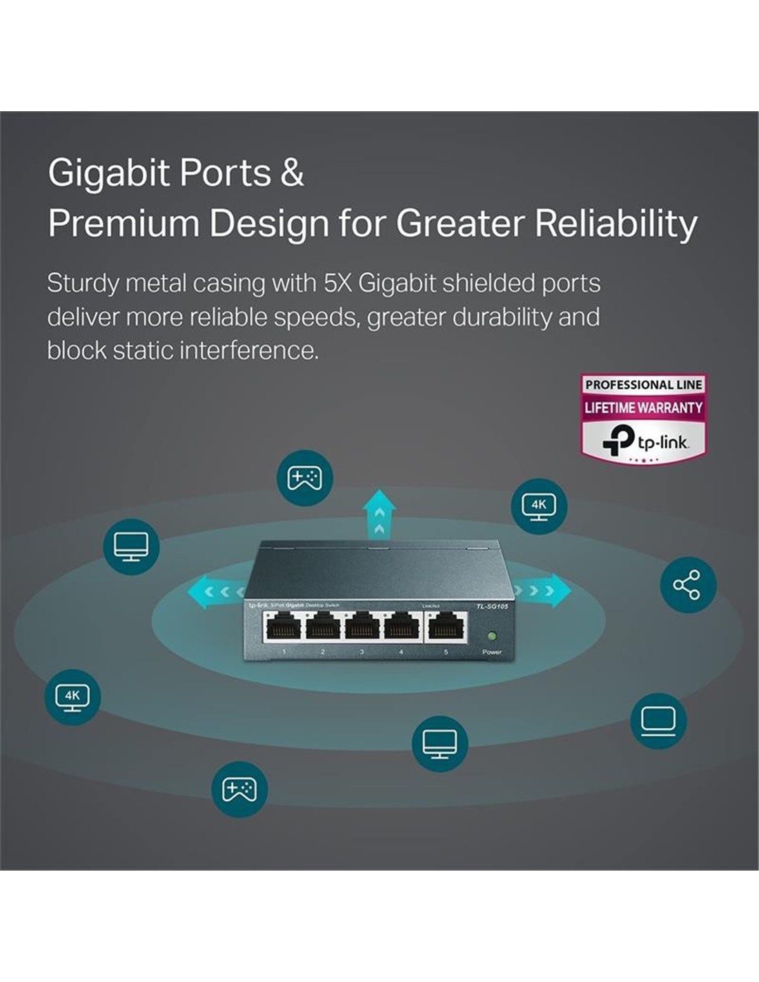 - Switch Gigabit. Presentado con 5 puertos de 10/100 / 1000Mbps, TL-SG105S amplía enormemente la capacidad de tu red, permitiendo la transferencia instantánea de archivos grandes. Por lo tanto, los usuarios avanzados del hogar, la oficina, el grupo de trabajo o el entorno de producción creativa ahora pueden mover archivos grandes con un ancho de banda más rápido. Transfiere gráficos, CGI, CAD o archivos multimedia a través de la red al instante.
