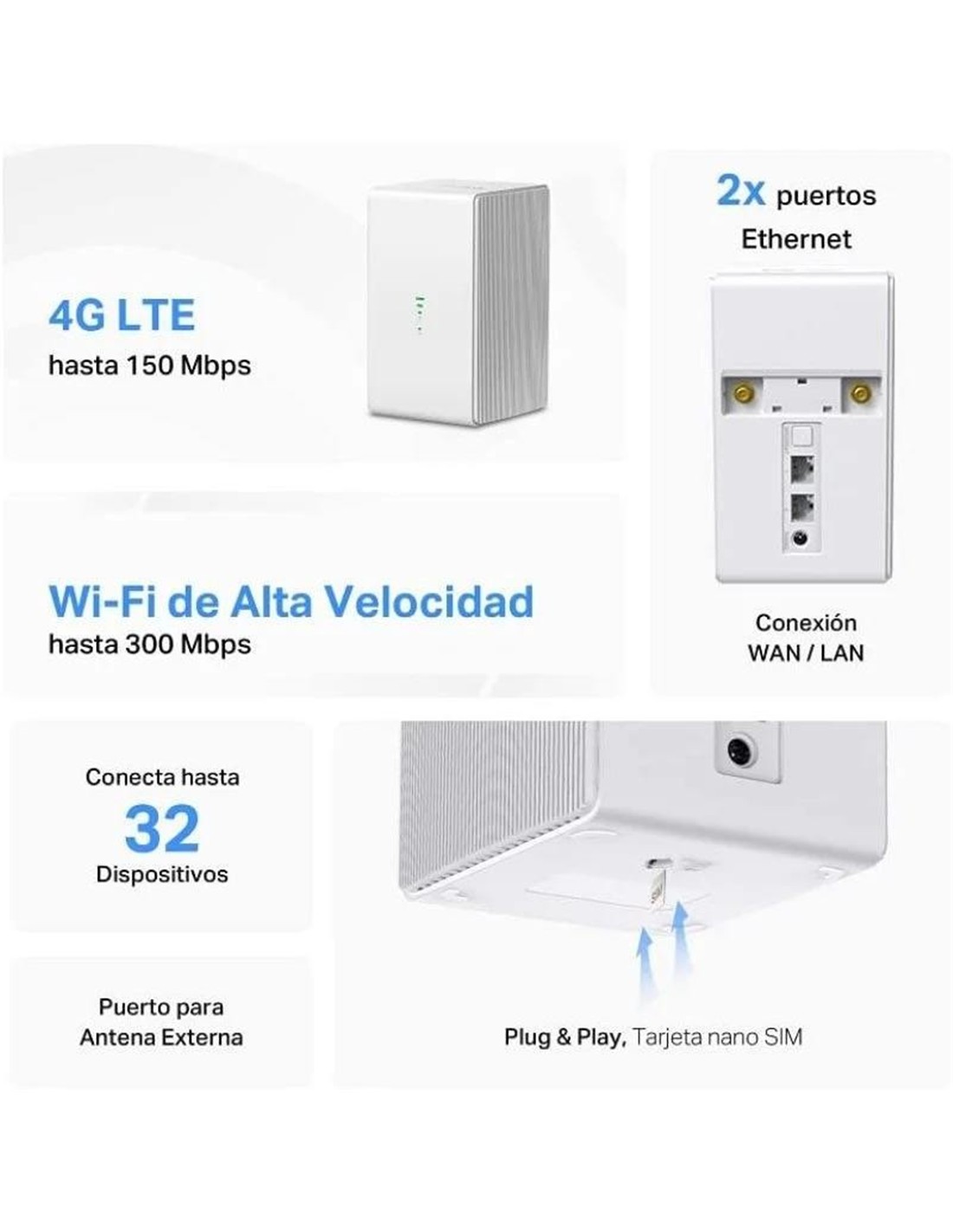 - Conectividad 4G y Wi-Fi: Permite acceso a Internet en cualquier lugar usando una tarjeta SIM 4G y es compatible con hasta 32 dispositivos simultáneamente, con velocidad Wi-Fi de hasta 300 Mbps (Wi-Fi 4 en banda de 2.4 GHz).